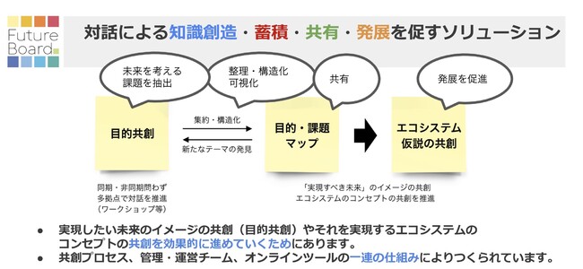 Future Boardは、「実現すべき未来」のイメージ、アジェンダ(ナラティブ、スコープ、要素)の共創や、それを実現するエコシステムのコンセプトの共創を進めていくための、対話による知識創造・蓄積・共有・発展を促すソリューションです。オープン・フラットに同期・非同期の対話による知識創造を促進し、実現したい未来と、そのエコシステムの仮説づくりを加速します