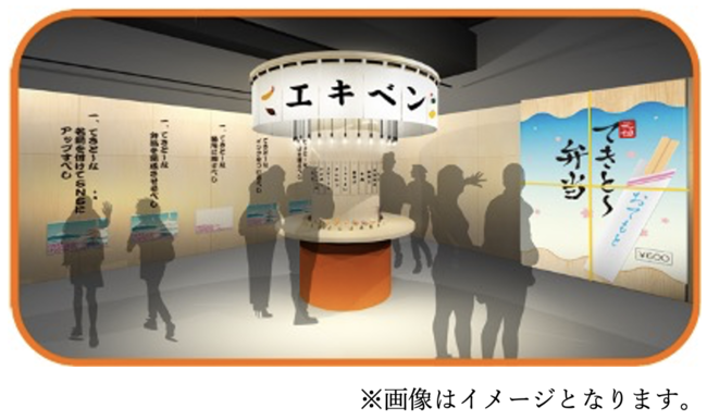 ここでは、鉄道の魅力の一つ「駅弁」をモチーフにした「てきと~駅弁作り」を楽しめます。エキベン・タウンでは、本物の駅弁同様に様々な弁当箱から選んで、約28種もの具材のスタンプを押すことで、自分だけの「てきと~駅弁」を作ることができます。