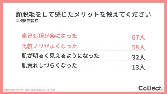ディーエムソリューションズ株式会社(東証スタンダード上場)が運営するメディア「Collect.(コレクト)」では、クリニックでの顔脱毛経験者100人を対象に、アンケート調査を実施しました。