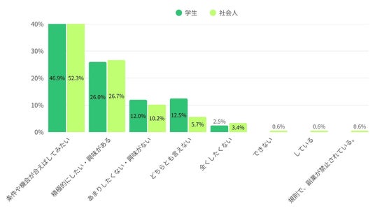 特に学生の26.0%が「積極的にしたい」と回答しており、学生時代から副業への関心が高い。