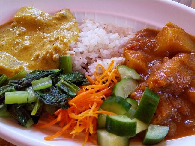 野菜ソムリエでもある店主がじっくり丁寧に作るspice PRIMULAのカレーは、小麦粉もルーも使わず、たくさんの野菜とコラーゲンたっぷりチキンスープで作った、ヘルシースパイスカレーです。マルシェの秋野菜をたっぷり使用した旬のカレーは、1皿で30品目以上の食材を取り入れた優しい味わい。甘口・中辛・辛口でご用意。ご飯は雑穀ごはんで、彩り野菜のつけ合わせも3種付きます。