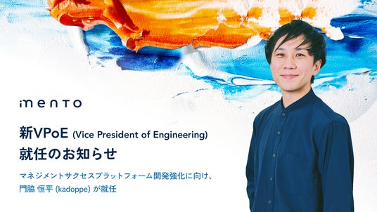 マネジメントサクセスプラットフォーム「mento(メント)」を提供する株式会社mento(本社:東京都港区、代表取締役:木村憲仁、以下mento)は、エンジニア組織のVPoE(Vice President of Engineering)に門脇恒平(kadoppe)が就任したことをお知らせいたします。開発・組織マネジメントを強化し、マネジメントサクセスプラットフォームを実現してまいります。