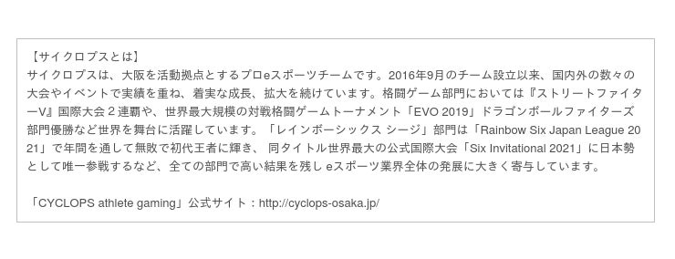 株式会社オプテージ(大阪市中央区)は、スポンサー契約を結ぶプロeスポーツチーム「CYCLOPS athlete gaming(サイクロプス・アスリート・ゲーミング、以下 サイクロプス)」と共同で、昨年に引き続き、eスポーツオンライン大会(全3回)を開催いたします。