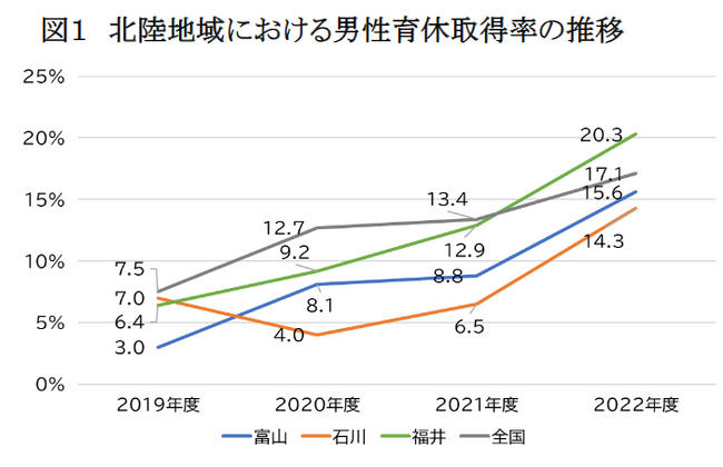 北陸地域は、全国と比較し、男性育児休業取得率が低い傾向があります(図1参照※1)。育児休業取得率が高い企業ほど、求人応募において有利に働くことが考えられることから、男性育休の推進は、人材獲得にもつながり、競争優位性の観点からメリットが多いほか、従業員のエンゲージメントの向上や、離職率の低下、残業削減にも寄与することが明らかになっています(※2)。