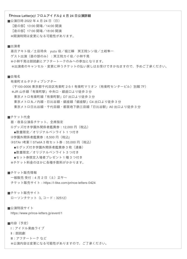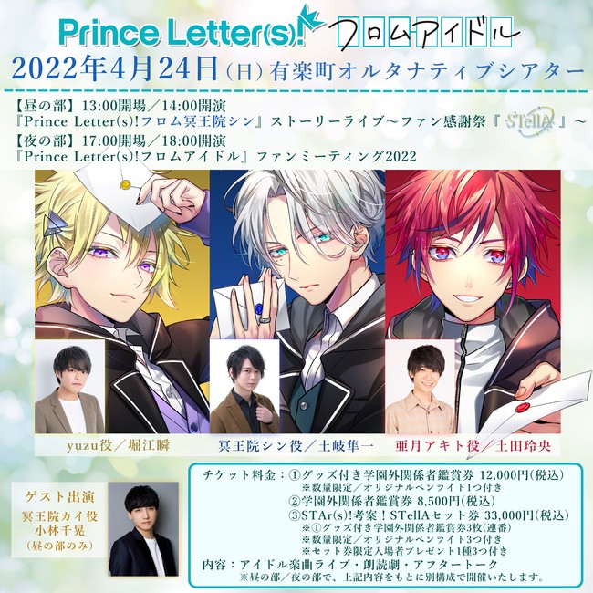4 月 24 日(日)に有楽町オルタナティブシアターにて、ボイスドラマ本編と連動した「『Prince Letter(s)! フロム冥王院シン』ストーリーライブ~ファン感謝祭『STellA』~」(昼の部)、一周年を記念した「『Prince Letter(s)!フロムアイドル』ファンミーティング 2022」(夜の部)を実施いたします。STAr(s)!の亜月アキト(CV:土田玲央)、yuzu(CV:堀江瞬)、冥王院シン(CV:土岐隼一)の 3 名に加え、昼の部にはスペシャルゲストとして冥王院カイ(CV:小林千晃)も出演し、アイドル楽曲ライブ、朗読劇、アフタートーク など盛りだくさんの内容でお届けします。チケットの一般販売は 4 月 2 日(土)よりスタートいたしますので、ぜひお早めにお買い求めください。 また、現在アフタートークの質問コーナーでお答えする質問を大募集しております。募集は“はがき”のみで、4 月 8 日(金)まで受け付けております。皆さまからのおたよりをお待ちしております。