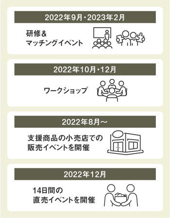 商談会に向けてのアドバイスや開催後のフォローアップのほか、地域内の連携を促進し、地域のブランド力を強化するためのワークショップや個別のマッチング等に対応できる体制を整備します。