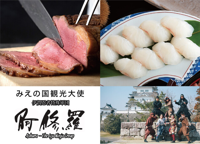 三重県伊賀市公認忍者として公認され、海外でも活躍中のハイレベルな忍者軍団「伊賀忍者特殊軍団 阿修羅」による迫力のパフォーマンスとともに、「"みえジビエ"鹿肉のロースト」や「伊勢まだいの炙り寿司」など、旬の"三重ジビエ"や豪華な三重グルメを堪能することができます。