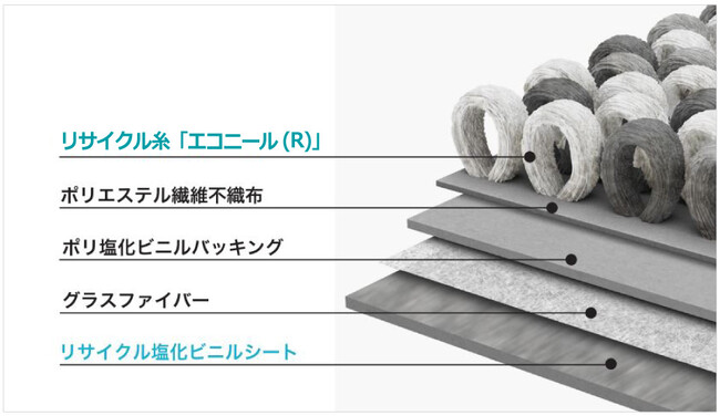 「NT double eco」は、表面のパイルと裏面のバッキング材にダブルでエコ素材を使用することで環境負荷の低減に貢献する商品です。パイルには、漁網やカーペット廃材などを再利用した100%リサイクル糸「エコニール (R)」を採用し、裏面のバッキング材には、使用済カーペットタイルの廃材を再利用した「リサイクルバッキング」を用いることで、CO2排出量を当社従来品比※1 で最大約61%削減します。また、再生材比率は最大約49%を実現しています。