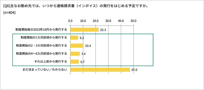 時期が決まっている企業のうち、過半数は制度スタートの2023年10月より前にインボイスの発行を予定しており、2023年の前半から実際にインボイスが届きはじめる可能性があります。