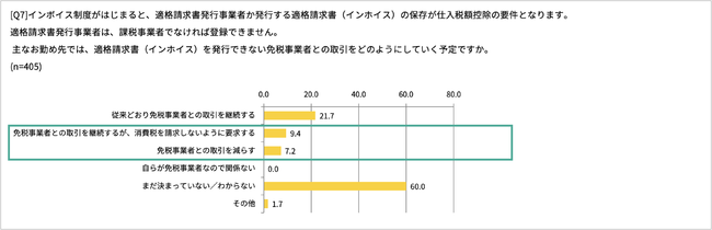 残り40%のうち、従来どおり継続が過半数の21.7%、消費税を請求しないように要求したり取引を減らすなど取引に変化が生じる企業が16.6%。