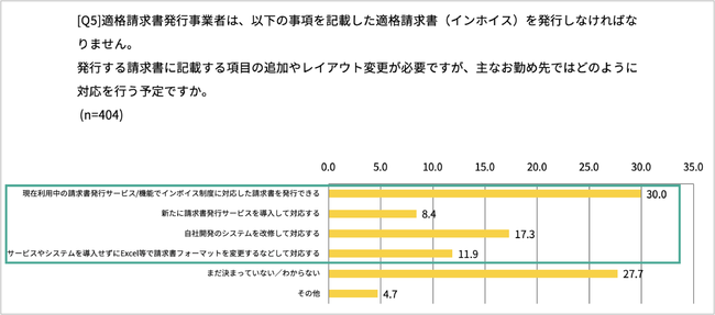 インボイスを発行するための項目追加やレイアウト変更は、67.6%と多くがどのように対応するか、方針が決まっていると回答しました。