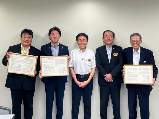(左から)パナソニック内装建材 岸本社長、ヤマト住建 中川、兵庫県農林水産部 守本部長、なか・やちよの森公園協会 吉田会長、ハリマック 湯浅会長