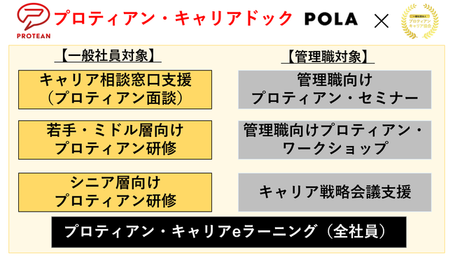 ポーラの中長期成長に向けた組織改革におけるキャリア自律部分のパートナーとして、キャリア自律最先端知見である現代版プロティアン・キャリアを全面的に導入頂きまして組織改革に伴走いたします。なお、PCDの提供サービスは、以下の通り全社員にプロティアン・キャリアeラーニング導入しキャリア定義を共通言語化したうえで、キャリア相談窓口支援、管理職向けセミナー、ワークショップ、ミドル、シニア向けのキャリア研修を通じてポーラの在りたい人物像「ValueCreator」の創出に向けて多岐に渡るご支援により組織開発に取り組みます。