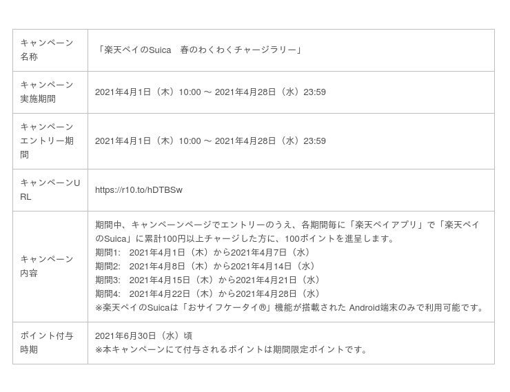 楽天ペイメント株式会社(本社:東京都港区、代表取締役社長:中村 晃一、以下 楽天ペイメント)は、運営するスマホアプリ決済サービス「楽天ペイ(アプリ決済)」において、「楽天ペイのSuica 春のわくわくチャージラリー」を4月1日(木)から4月28日(水)まで実施します。