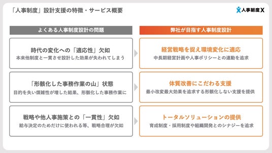 本サービスは、人事制度・採用制度・オンボーディング制度・育成制度といった企業内の基幹制度を、経営戦略に基づき設計・運用まで伴走する“実行支援型コンサルティング”です。