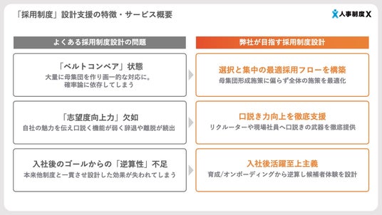 従来の採用制度設計は、画一的なプロセスや確率論的なアプローチが中心となりがちで、志望度の醸成や入社後の活躍までを見据えた工夫には限界がありました。