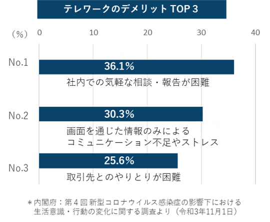 コロナ禍をきっかけに世の中にテレワークが浸透し、従来にはなかった多様な働き方が実現できるようになっています。一方で、内閣府がテレワーク経験者に対して行った調査では、「社内での気軽な相談・報告が困難」や「画面を通じた情報のみによるコミュニケーション不足やストレス」などのテレワークに対するデメリットを感じている方もいることがわかりました。テレワークから出社への切り替えを検討する方も今後増えるのではないかと考えられます。