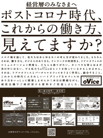 oViceは、ポストコロナ時代の経営を支える働き方を提案すべく、日本経済新聞・読売新聞・朝日新聞での広告掲出を行い、oVice導入を検討する皆さまの負担を軽減するための「導入検討資料」も公開しました。
