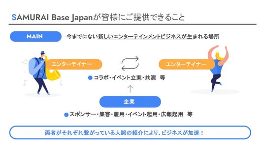 SBJ(SAMURAI Base Japan)は、日本のアーティスト・アスリートと企業がお互いに支え合える環境を生み出し、アーティスト・アスリートが活動しやすい世の中を実現するための応援コミュニティです。日本のエンターテインメント業界を盛り上げ、日本に元気をもたらし、才能を未来に繋ぐ活動を行っています。