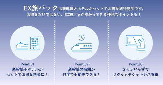 セットプランならではのコストパフォーマンスが魅力の「EX旅パック」。新幹線とホテルを別々に手配するよりもおトク(※)に旅行できます!※EX旅パック商品と個別で手配した場合を比較