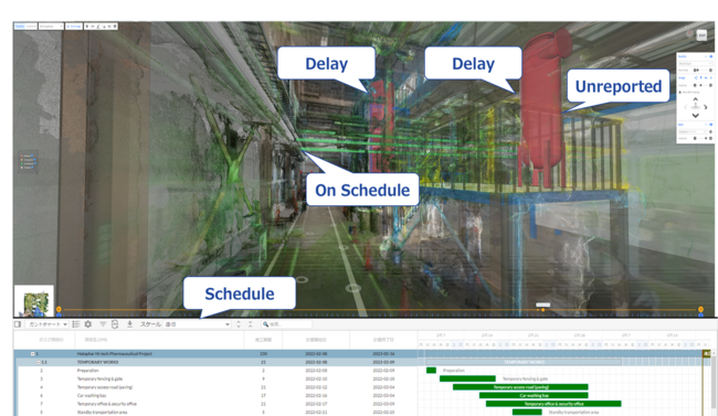 - 工程表を統合することで4Dモデルを作成し、工事の遅延や定時性を含めた進捗管理の可視化