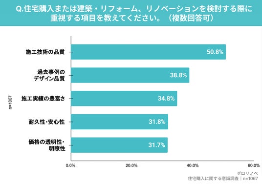 次に、住宅購入・建築・リフォーム時に重視する項目を聞いたところ「施工技術の品質」50.8%、「耐久性・安心性」38.8%、「施工実績の豊富さ」34.8%、「価格の透明性・明瞭性」31.8%、「過去事例のデザイン品質」31.7%という結果でした。