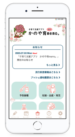 ライフスタイルの多様化による子育て世代のニーズの変化に伴い、一人一人の状況に合わせた子育て情報の発信や簡便な予防接種スケジュールツールを提供するため、鹿児島県内でも取り入れられている 子育て支援アプリ「子育てモバイル」を導入する運びとなりました。鹿屋市オリジナルのデザインを施し、子育て支援アプリ「子育て支援アプリ かのや育memo。」として提供いたします。