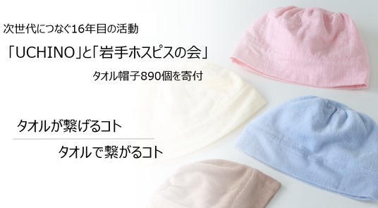バスタイムから快眠まで、健やかで心地よいライフスタイルを提案する内野株式会社(本社:東京都中央区/代表取締役社長:内野信行)は、がん患者を支援する市民団体「岩手ホスピスの会」へ、タオル帽子890個とタオル716枚を寄付したことをお知らせ致します。2009年から続く取り組みを通して、これまでにタオル帽子は27,125個、タオルは8,540枚寄付し、タオル帽子の輪を広げています。(https://www.uchino.co.jp/)