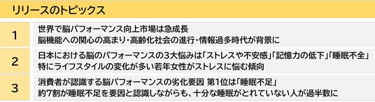 特に年度替わりや環境変化で心身の不調を感じやすい時期には、簡便で効果的な脳機能サポート製品が求められており、ここに脳パフォーマンス市場における新たなビジネスチャンスが存在します。
