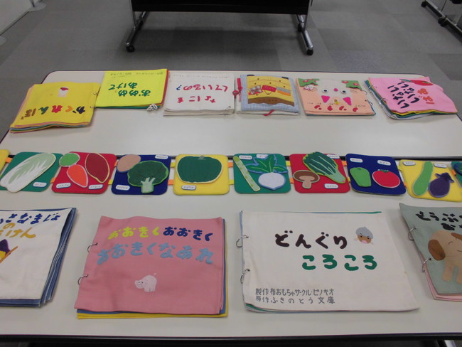 この取組は、同サークルの協力を得て図書館で平成5年から行ってるイベントで、布えほんやエプロンシアターによるおはなし会は、手作りの暖かさにあふれる楽しいひとときです。気持ちのこもった作品の展示もお楽しみください。