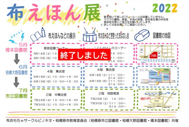 相模原市教育委員会は、布えほん等を手作りしているボランティアサークル「ピノキオ」との共催による「布えほん展」を相模大野図書館(同市南区)で開催します。