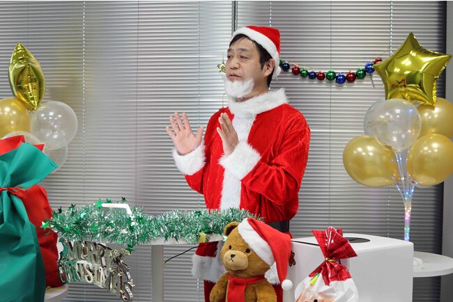 当日は、100組を超えるお施主様ご家族にご参加いただきました。サンタクロースとクリスマスツリーに扮した本部社員による司会に始まり、サンタクロースのコスプレをしたフィアスホームプレジデント近藤からのご挨拶、本部社員の自己紹介、プレゼント大抽選会などを実施しました。お施主様との交流にはチャットを活用し、本部社員からの質問に対する回答やイベントに対するコメントなどで交流を図りました。