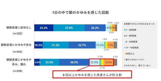 1日の中で眼のかゆみを感じた回数を質問したところ、「眼瞼皮膚にかゆみや赤み、腫れ」といった症状のある258人の患者さんのうち「6回以上かゆみを感じる」と回答した患者さんが約3割という結果でした。その内、12%の患者さんが「数えきれないくらいかゆみを感じる」と回答しました。