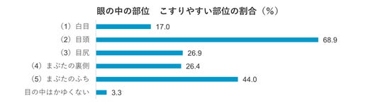眼の中の部位で、患者さんが「こすりやすい部位」については、68.9%が「目頭」と回答し、次いで多かったのが、「まぶたのふち」の44.0%、「目尻」が26.9%でした。