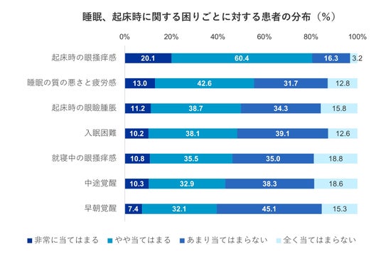 症状(花粉症による眼のかゆみ)によって起こる睡眠、起床時に関する困りごとに関する質問では、「非常に当てはまる」、「やや当てはまる」と回答した割合がもっとも多かった項目としては、「起床時の眼搔痒感(80.5%)」、次いで「睡眠の質の悪さと疲労感(55.6%)」でした。また、かゆみによって中途覚醒(43.2%)や早期覚醒(39.5%)など、睡眠からの覚醒に影響が出ていると感じる患者さんがいることも分かりました。