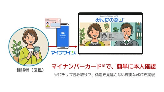 また、当社のマイナンバーカード認証アプリ「マイナサイン(R) ※」による本人確認・電子署名にも標準対応しており、スマートフォンでマイナンバーカードを読み取るだけで確かな認証が完了し、「相談」と「厳格な認証」を一体化することで、オンライン完結が難しかった複雑な手続きのDXを強力に推進いたします。