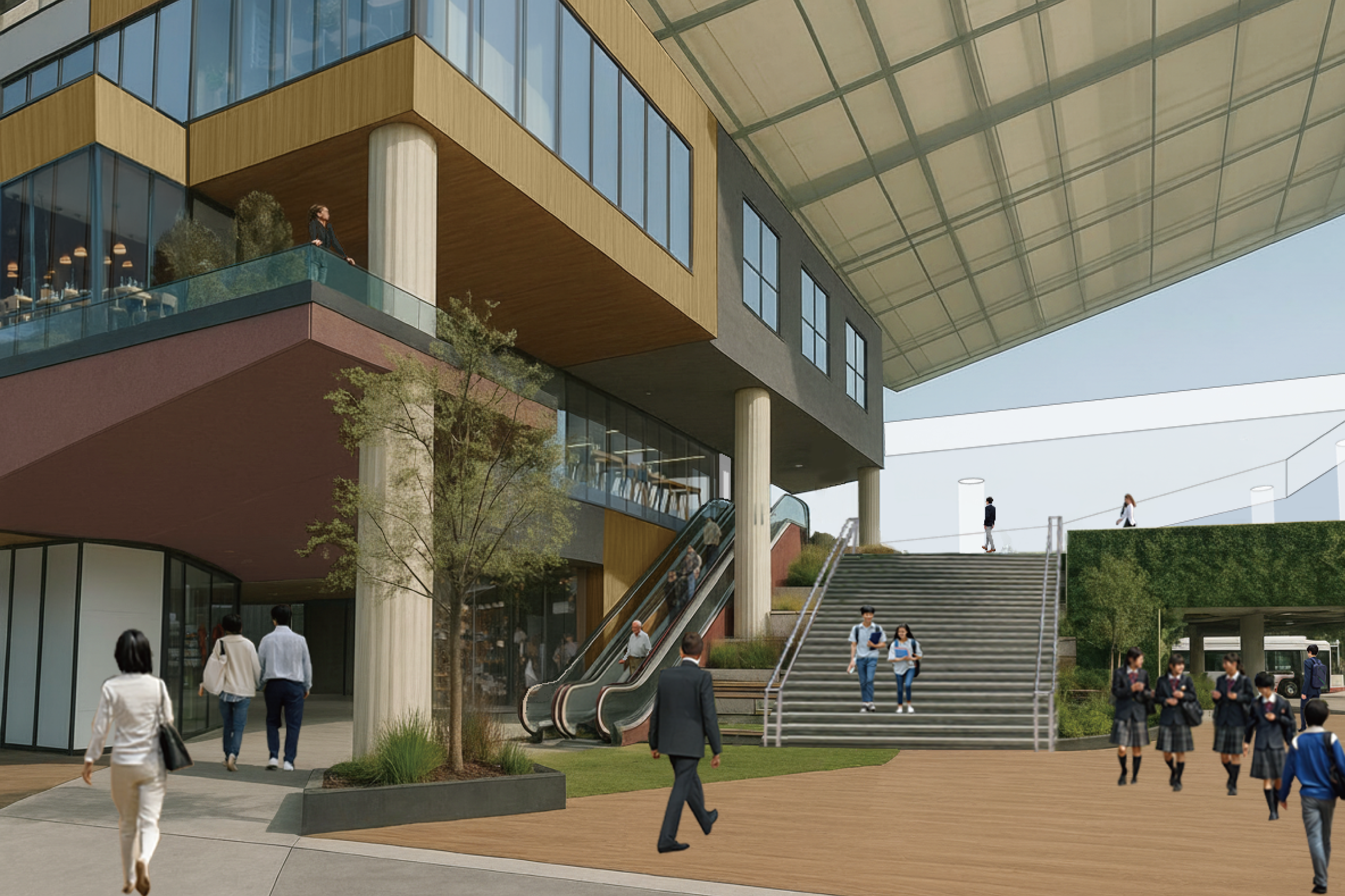 「1階 駅前南コンコース」大階段と駅前商業施設イメージ