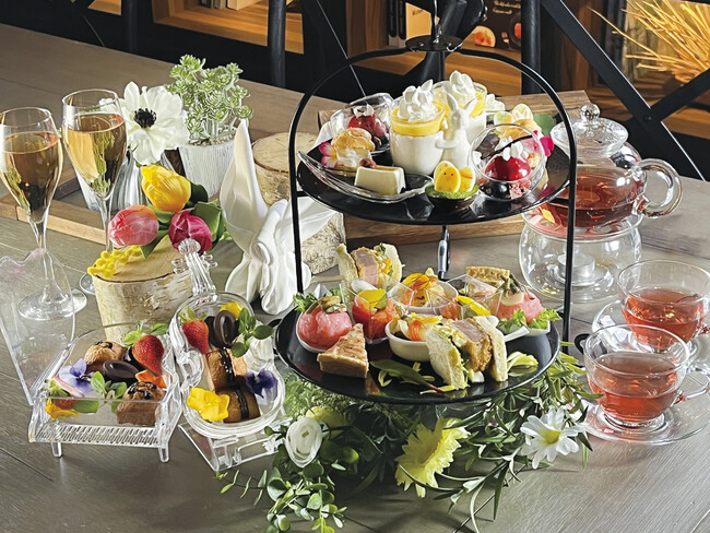 イースターバニーが抱えるマンゴープリン、ひよこ菓子と卵がのった生クリーム抹茶クランチ、ピアノやチェロの器に盛りつけられたスイーツなどのフォトジェニックな「Sweets Plate(スイーツプレート)」、サクラエビや春キャベツなど旬の食材を使った春らしい彩りの「Light Meal Plate(ライトミールプレート)」の2段プレートに加え、ホテルパティシエが焼き上げる自家製スコーン3種の食べ放題(90分)と、フリードリンク(90分)、乾杯ノンアルコールスパークリングワインがセットになった、盛りだくさんの季節のアフタヌーンティーをお楽しみください。