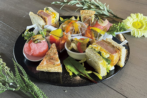 厚切りハムカツと春キャベツ、奥久慈卵のサンドウィッチ/桜色の洋風山菜おこわ/サクラエビと菜の花のキッシュロレーヌ/季節の魚のエスカベッシュ/カラフルピクルスと人参ラペ