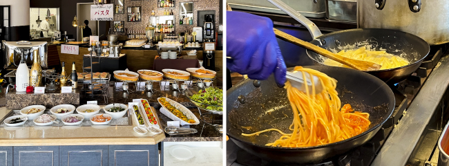 茨城県産の食材を中心にサラダバーや、ドリンクバー、スープ、温菜、冷菜、パスタ、デザート等の約30品目がブッフェ形式でお楽しみいただけます。パスタはライブキッチンで出来立てをご提供いたします。