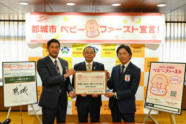 「ベビーファースト運動」は、子どもを産み育てたくなる社会を実現するための運動です。企業や個人・行政が、みんなで子どもを育んでいく優しい社会を目指す取組で、公益社団法人日本青年会議所が推進しており、この趣旨に賛同し都城市も参画。令和5年2月15日に池田市長が「ベビーファースト宣言」を行いました。