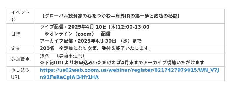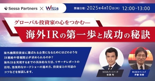 投資家と上場企業を結ぶIR支援カンパニーである株式会社ウィルズ(本社:東京都港区、代表取締役社長:杉本 光生)とSESSAパートナーズ株式会社(本社:東京都港区、代表取締役:杉渕 均)は2025年4月 10日 (木)に 『グローバル投資家の心をつかむ-海外IRの第一歩と成功の秘訣』 共催ウェビナーを実施いたします。