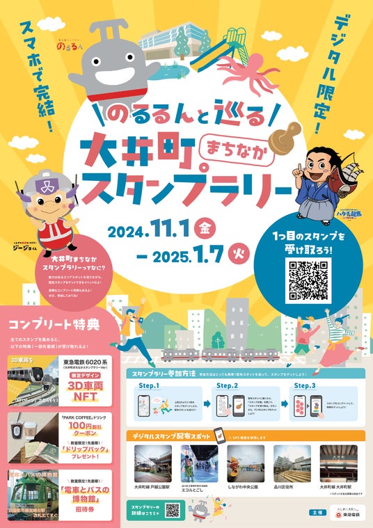 本イベントは、大井町エリアのおすすめスポットを巡りながら、「東急線キャラクター のるるん」「しながわ防災キャラクター ジージョくん」「しながわ観光大使(見習い) ハタチの龍馬」が掲載された、本イベント限定のデジタルスタンプ(NFT)を集めていただくことができます。デジタルスタンプ全6種類を全て受け取っていただいた方には、コンプリート景品(3D車両NFT、店舗割引クーポン等)がプレゼントされます。