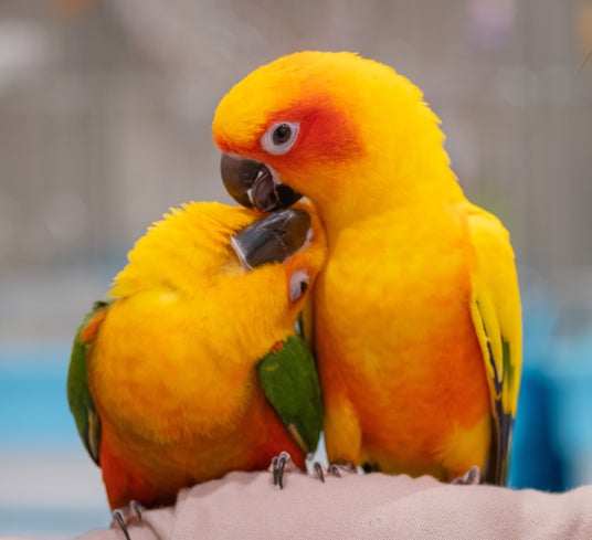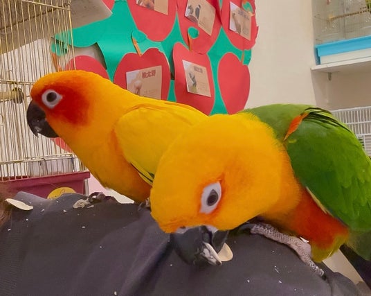 癒しの空間「ことりすまいる」に、コガネメキシコインコの「うめ」と、ナナイロコガネメキシコインコの「なな」がやってきました♪