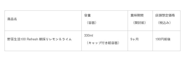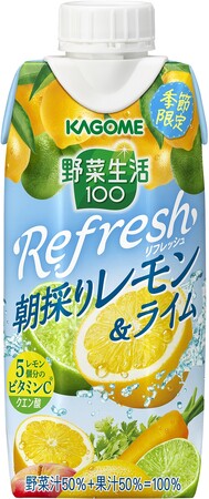 「野菜生活100 Refresh 朝採りレモン&ライム」は、朝採りレモンとライムの爽やかなピール感で、すっきりとした美味しさが特長の野菜果実ミックスジュースです。砂糖不使用で、レモン5個分のビタミンC※が摂れます。仕事や家事、勉強などの合間のリフレッシュタイムにおすすめです。