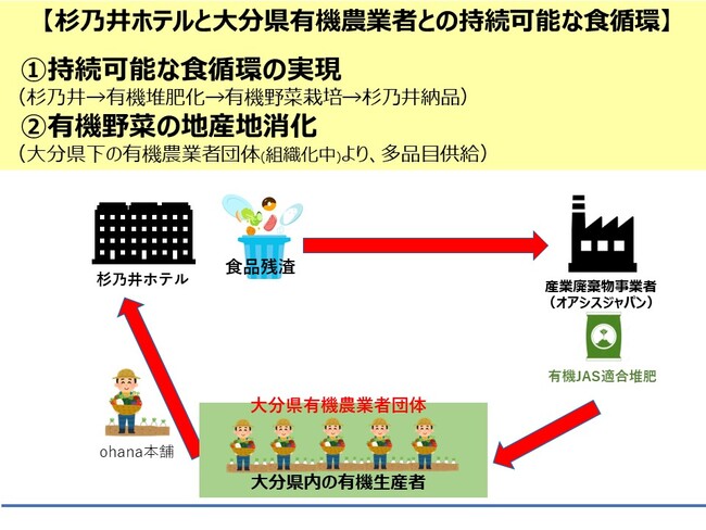 施設から排出された食品残渣は、地元企業の株式会社オアシスジャパン(本社:大分県大分市、社長:吉武 篤)により、全て回収・堆肥化されます。杉乃井ホテルでは今回、その堆肥を使用して農作物の生産をしている地元農家のohana本舗(本社:大分県臼杵市、代表取締役社長:赤嶺 祐司)で生産された有機野菜を購入し、食品残渣のリサイクルと地元野菜の地産地消を実現しました。