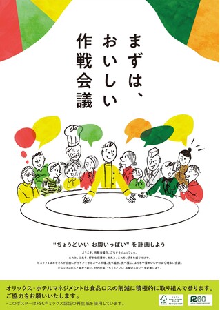 杉乃井ホテルを運営するオリックス・ホテルマネジメントでは、運営の各施設において、自然環境の負荷低減につながるさまざまな取り組みを推進しています。食品ロス削減に向けた取り組みでは、無駄のない食材調達やビュッフェ提供時における、必要量に見合った料理提供の実施、また2024年度の再生利用率50%※を目指し、廃棄された食品の再生利用などを推進しています。運営する宿泊施設のうち、杉乃井ホテルを含む、レストランなどの料飲施設をもつ16施設では、食品ロス削減の啓発を目的とした、ポスターやPOPの掲示も実施しています。