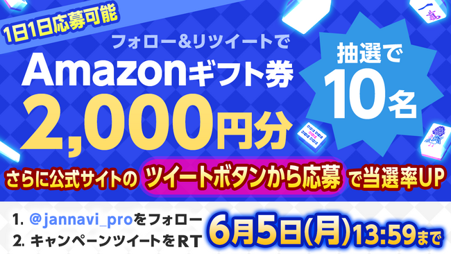 2023年5月26日(金)12:00よりオンライン麻雀アプリ「ジャンナビ麻雀オンライン」Twitter公式アカウントにて抽選でamazonギフト券2000円分を10名様にプレゼントするキャンペーンを実施いたします。