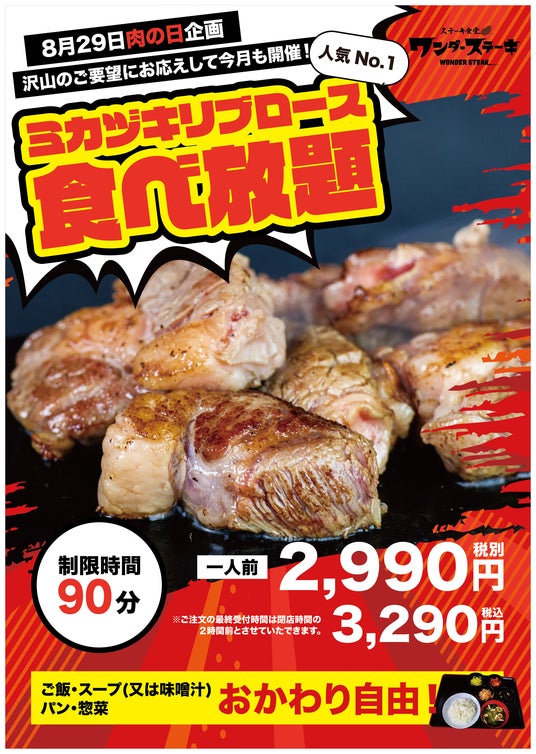 ワンダーステーキを展開する株式会社C-HUNDRED(所在地:大阪府大阪市北区、代表:細原誠は、ワンダーステーキの店舗にて、8月29日(木)の肉の日に「夏休みチャレンジ・ミカヅキリブロース食べ放題」と題した企画を実施します。