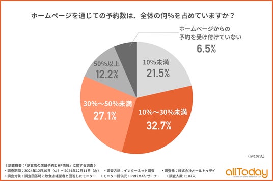 続いて、「ホームページを通じての予約数は、全体の何%を占めていますか?」と質問したところ、『10%~30%未満(32.7%)』と回答した方が最も多く、『30%~50%未満(27.1%)』『10%未満(21.5%)』『50%以上(12.2%)』『ホームページからの予約を受け付けていない(6.5%)』と続きました。